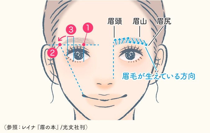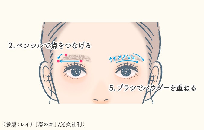 眉は「毛がないところに描く」のが大原則。何もないところにいきなり描くと失敗しやすいので、ガイドになる点を3カ所ペンシルで入れます(上記画像参照)。②はブラシの柄などを当てて位置を決めるとよいでしょう。