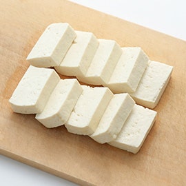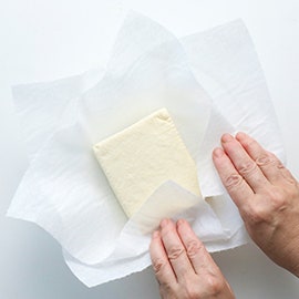 1木綿豆腐は耐熱皿の上に敷いたペーパータオルで2重に包み、電子レンジ(600Wで2~3分)で加熱して水切りをする。