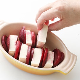 5耐熱皿にオリーブオイルを塗り、②の豆腐とビーツを交互に並べる。