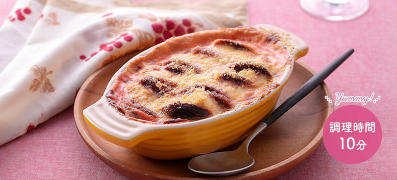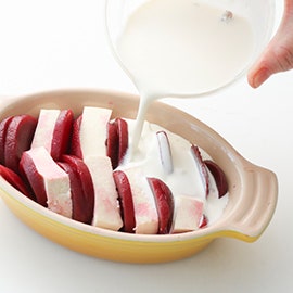 フランスの地方料理の「グラタン・ドフィノワ」(じゃがいものグラタン)をアレンジしたレシピは、じゃがいもの代わりにビーツを使用。ビーツはビタミンやミネラルを豊富に含み、その栄養価の高さから近年注目度が高まっています。ビーツの水煮は、そのままでも食べられるので、サラダやスムージーでいただいても美味しいですよ。