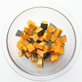 2南瓜は電子レンジ(600Wで約2分)にかけて、軟らかくしておく(茹でる場合は約3分)。