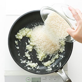 3フライパンにバター・オリーブ油を熱し、玉ねぎを炒めてしんなりしてきたところへ米を加えて炒める。