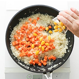 4③の米が透明になれば、にんじんと銀杏を加えてさらに炒め、最後にむきえびを加えて炒め塩・こしょうする。全体に油が回るように炒める。