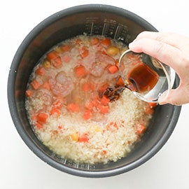 5炊飯器の釜に④を入れ、醤油を加えた後、目盛りの2合まで①のだしを注ぎ炊飯する。